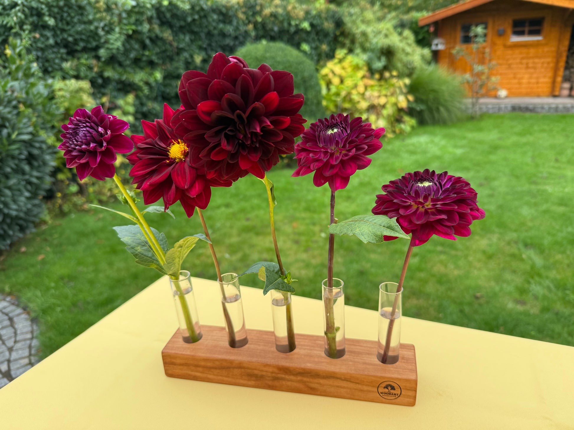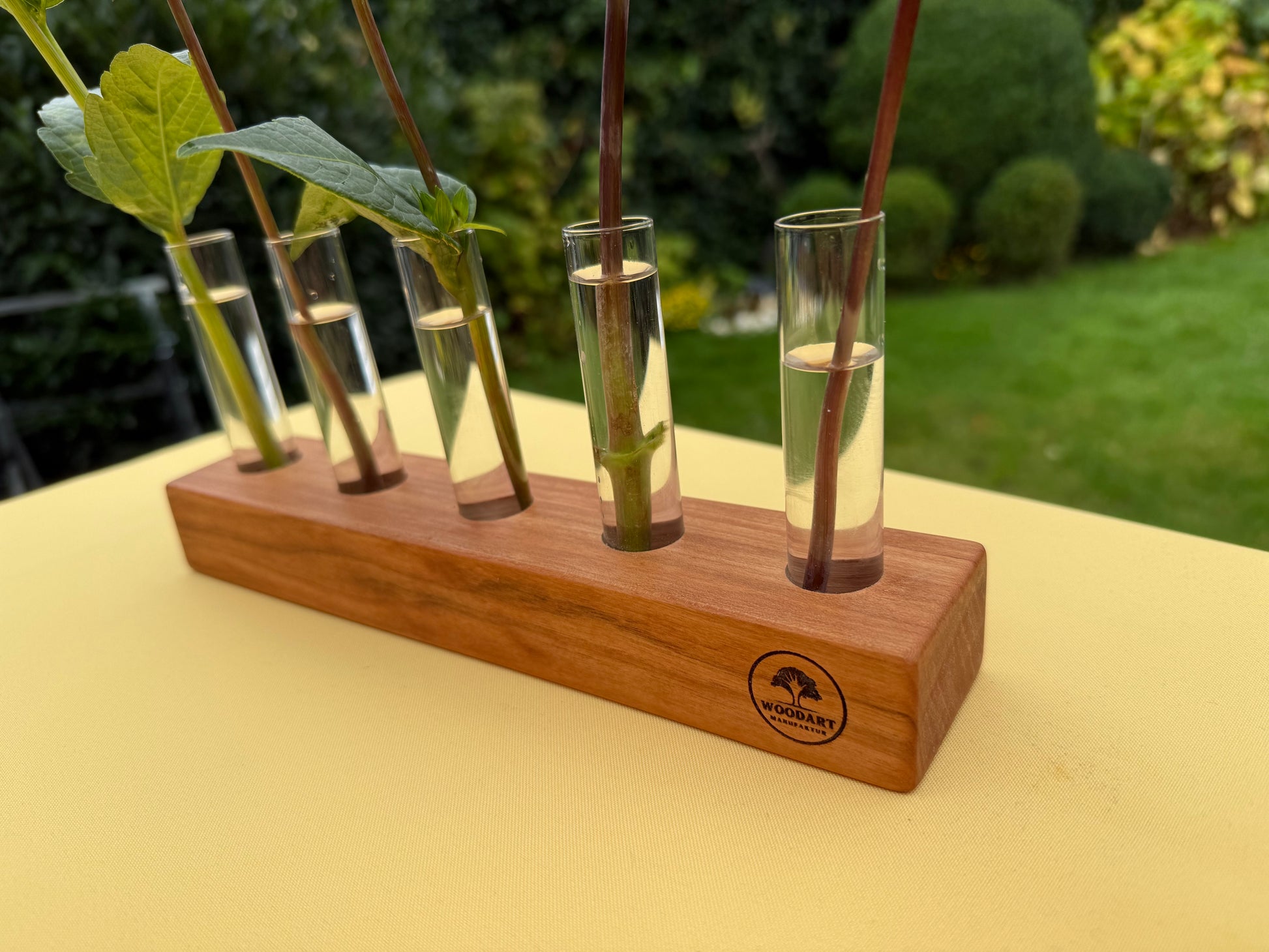 Blumenvase mit Reagenzgläsern in Rosenholz