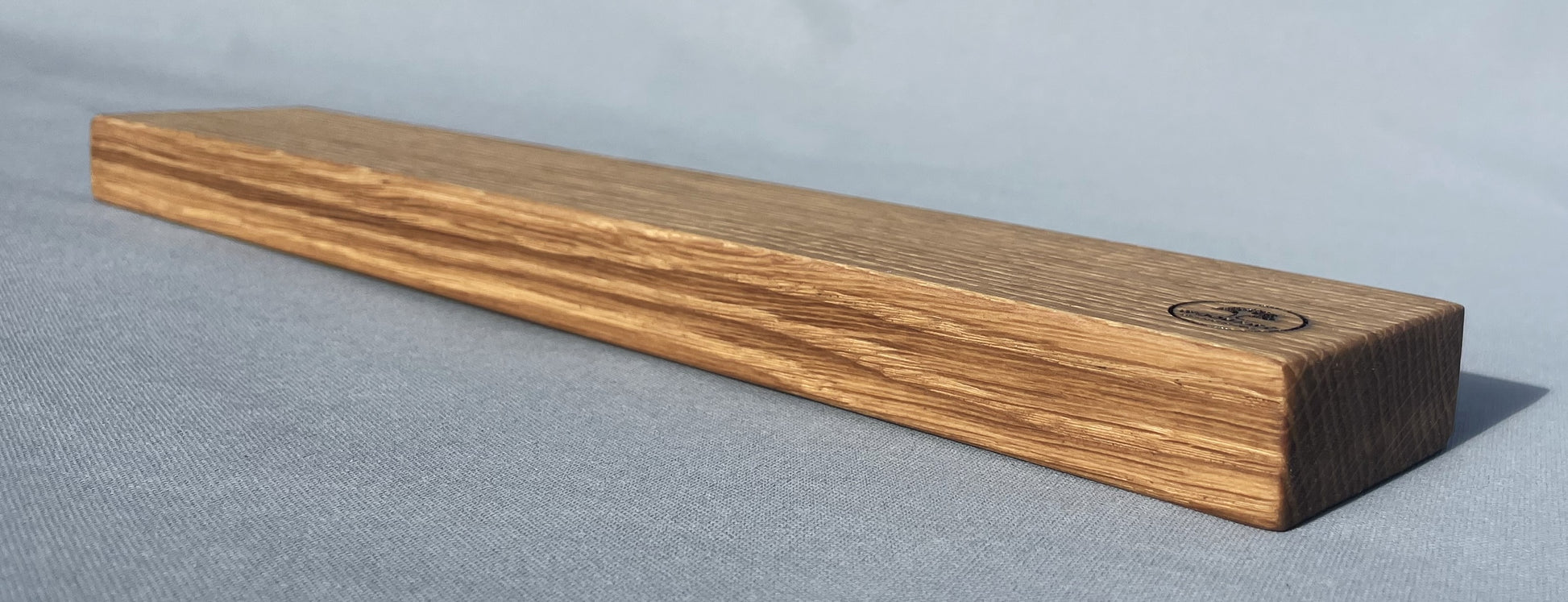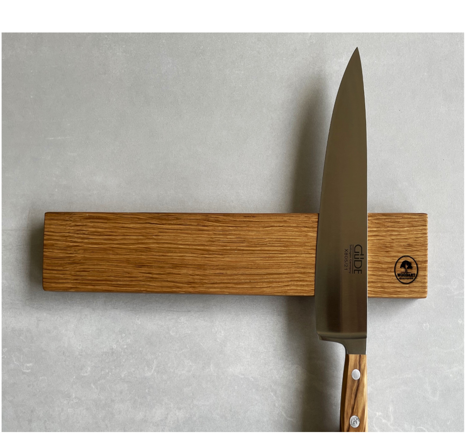 Magnetischer Messerhalter zur Wandmontage aus massivem Edelholz "Eiche". Unsichtbar auf der Rückseite eingelassene extra starke Magnete für sicheren Halt. Schützt Klingen vor dem Stupf werden und präsentiert sie in stilvoller Optik – jederzeit das richtige Messer griffbereit. Montage zum Kleben oder Bohren für perfektem Halt auf jeder Oberfläche. Maße und Kanten individuell konfigurierbar. 100% handgefertigt in Deutschland.