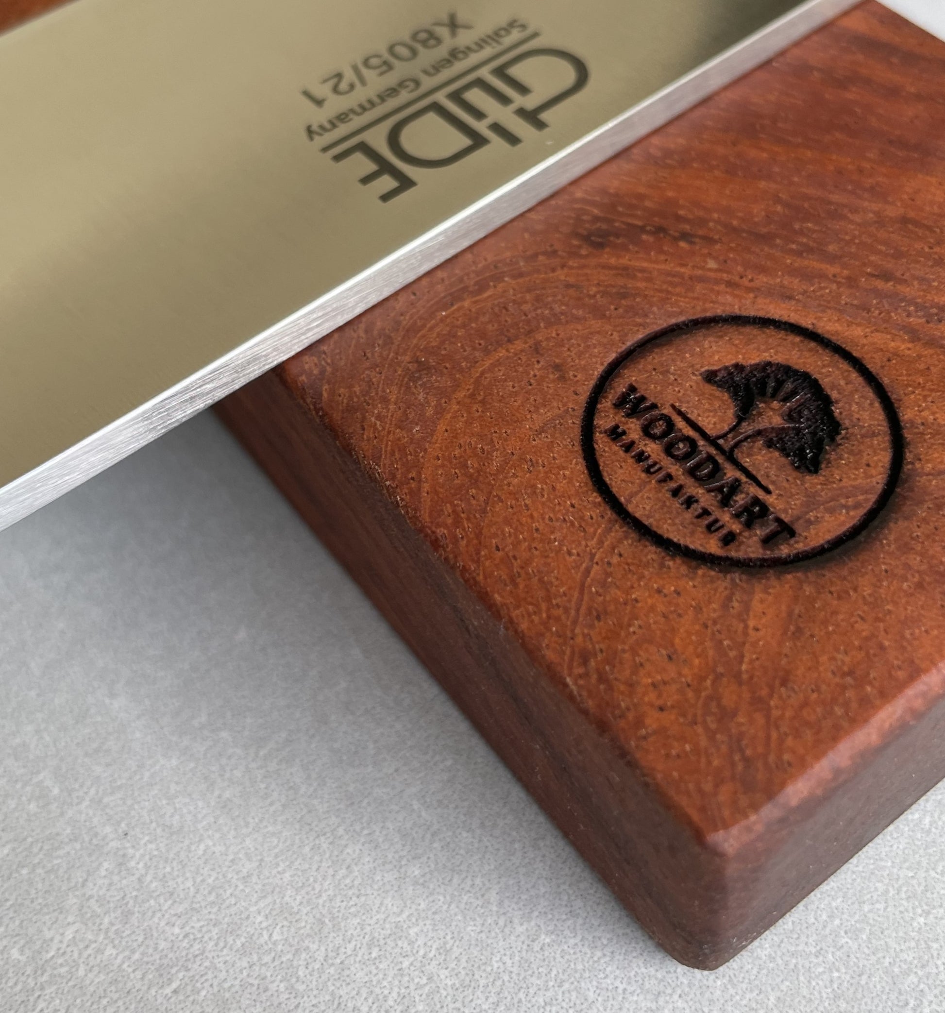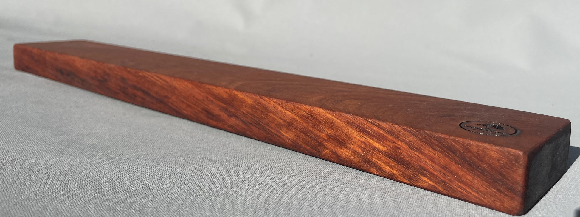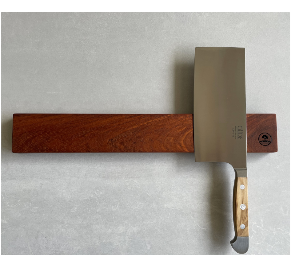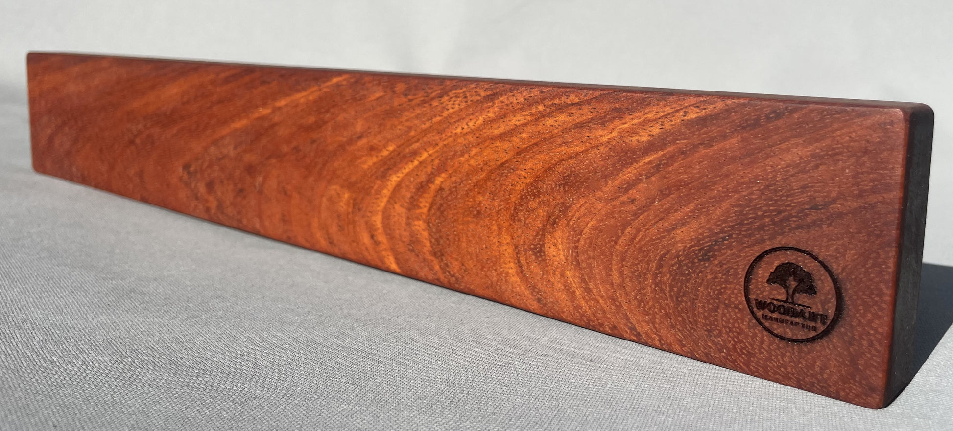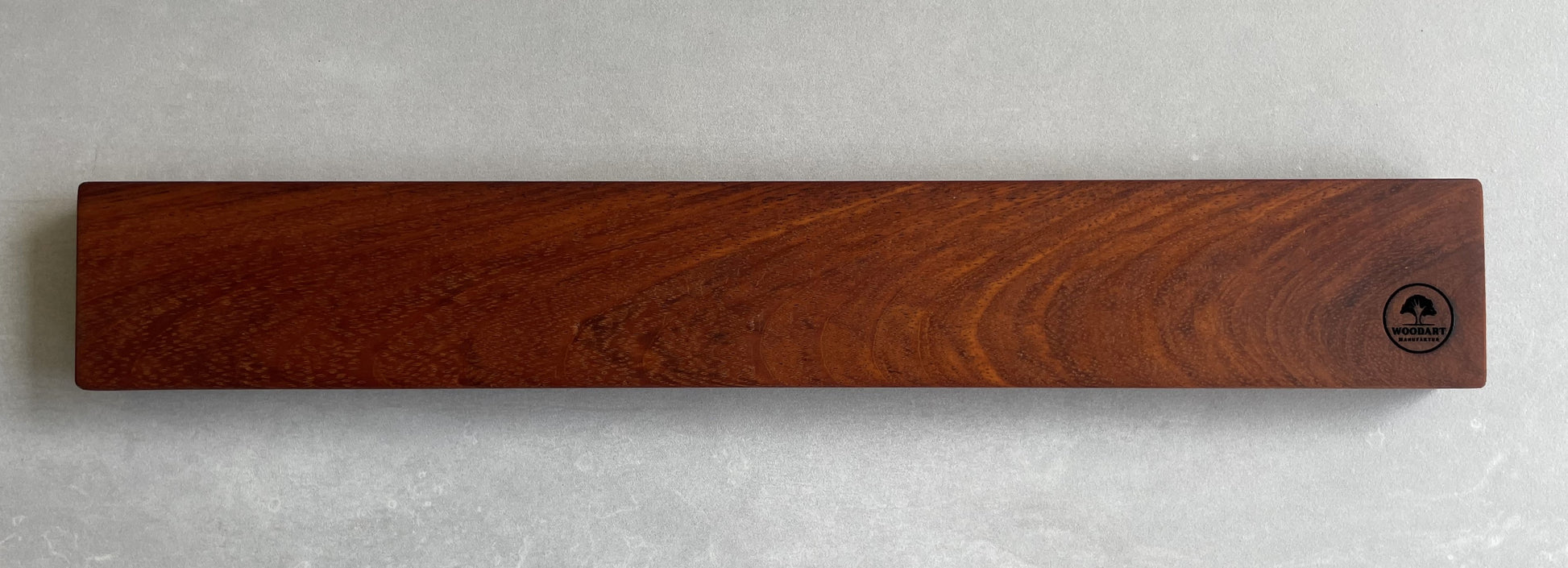 Magnetischer Messerhalter zur Wandmontage aus massivem Edelholz "Merbau“. Unsichtbar auf der Rückseite eingelassene extra starke Magnete für sicheren Halt. Schützt Klingen vor dem Stupf werden und präsentiert sie in stilvoller Optik – jederzeit das richtige Messer griffbereit. Montage zum Kleben oder Bohren für perfektem Halt auf jeder Oberfläche. Maße und Kanten individuell konfigurierbar. 100% handgefertigt in Deutschland.