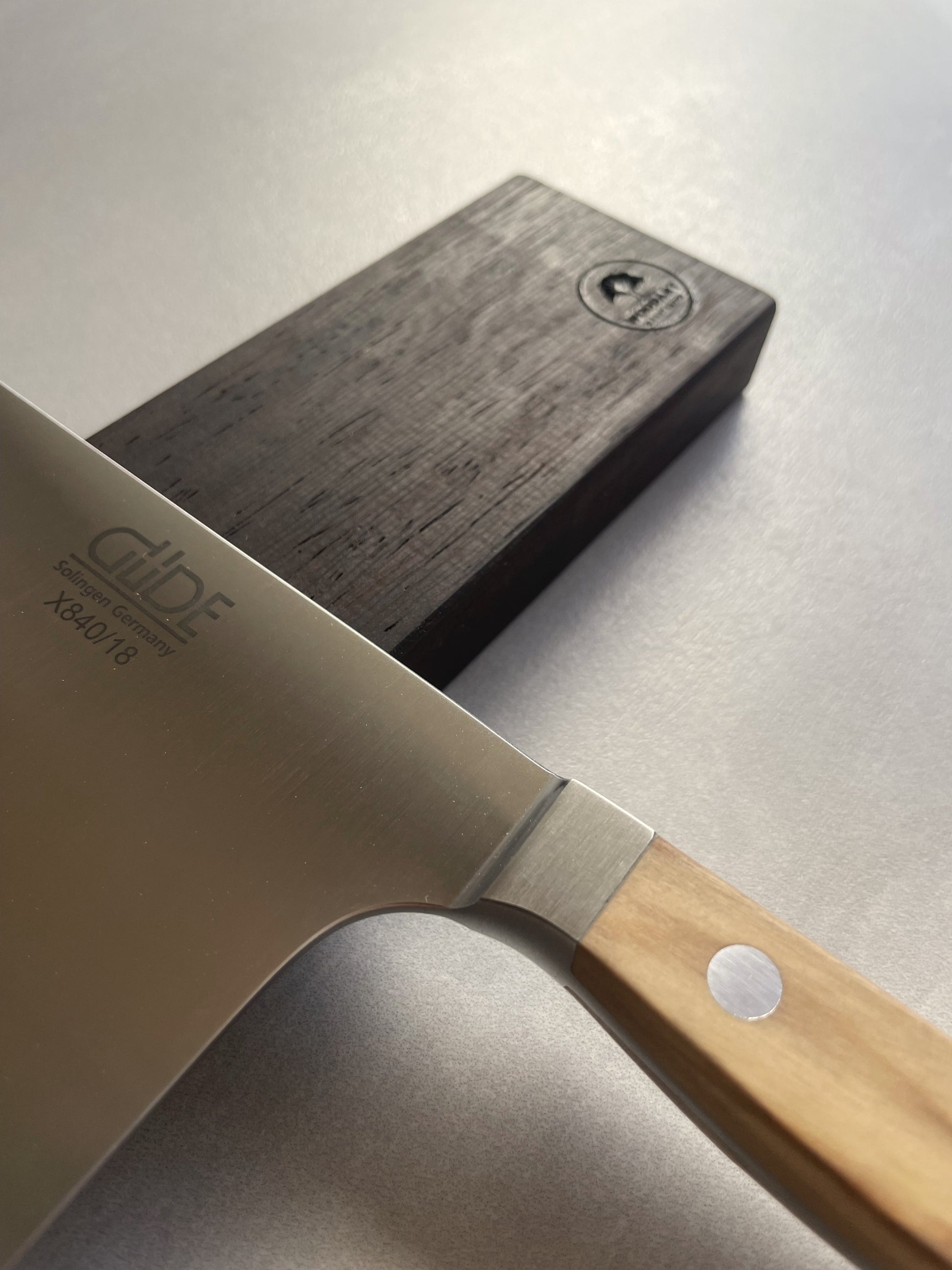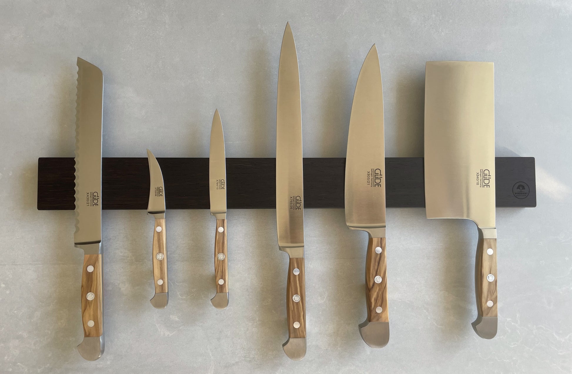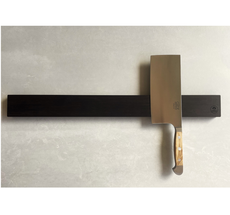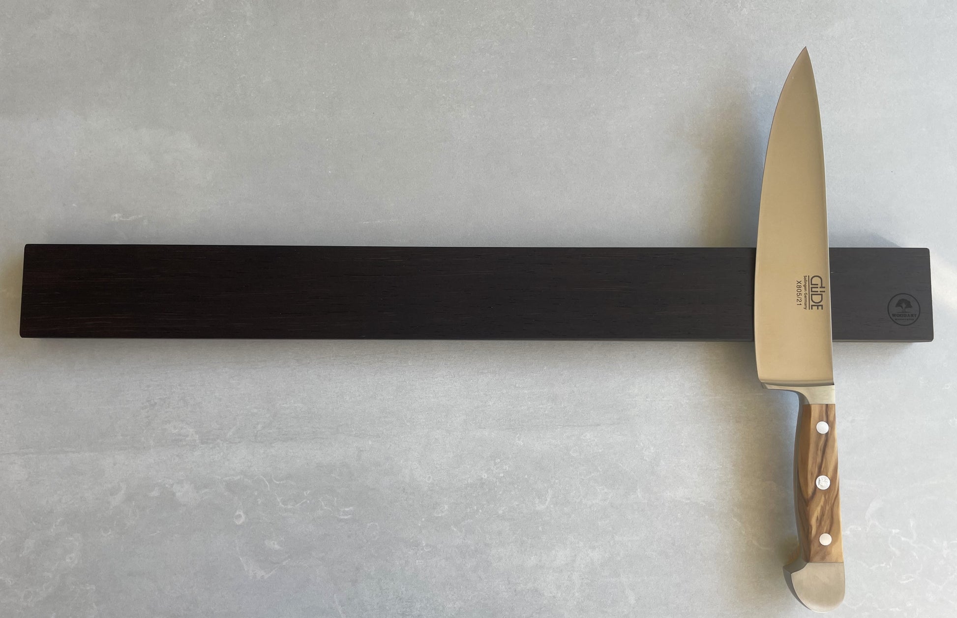 Magnetischer Messerhalter zur Wandmontage aus massivem Edelholz „Wenge“. Unsichtbar auf der Rückseite eingelassene extra starke Magnete für sicheren Halt. Schützt Klingen vor dem Stupf werden und präsentiert sie in stilvoller Optik – jederzeit das richtige Messer griffbereit. Montage zum Kleben oder Bohren für perfektem Halt auf jeder Oberfläche. Maße und Kanten individuell konfigurierbar. 100% handgefertigt in Deutschland.