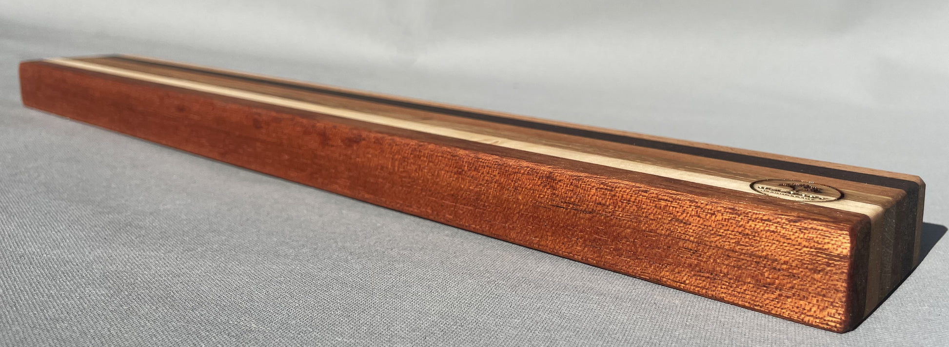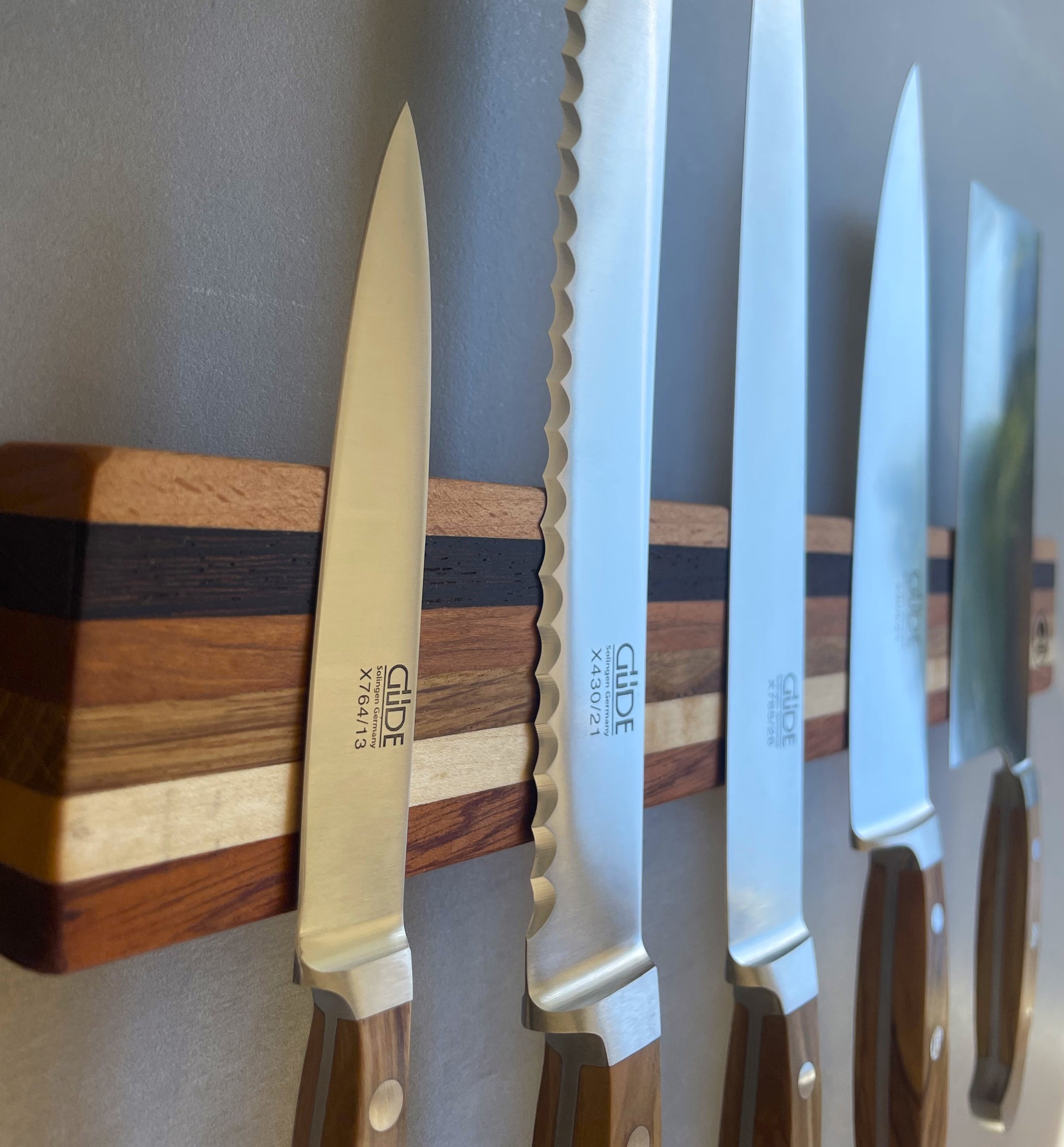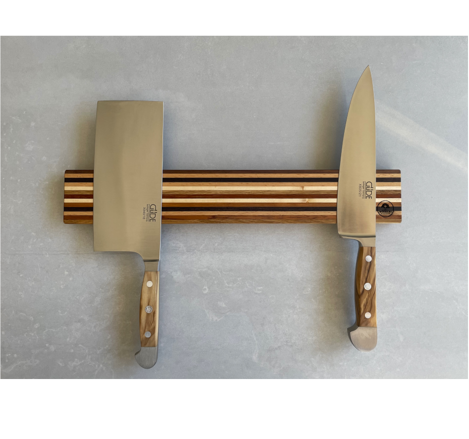 Magnetischer Messerhalter zur Wandmontage aus massiven Edelhölzern „Wenge, Merbau, Eiche, Ahorn, Kirsche, Buche“. Unsichtbar auf der Rückseite eingelassene extra starke Magnete für sicheren Halt. Schützt Klingen vor dem Stupf werden und präsentiert sie in stilvoller Optik – jederzeit das richtige Messer griffbereit. Montage zum Kleben oder Bohren für perfektem Halt auf jeder Oberfläche. Maße und Kanten individuell konfigurierbar. 100% handgefertigt in Deutschland.